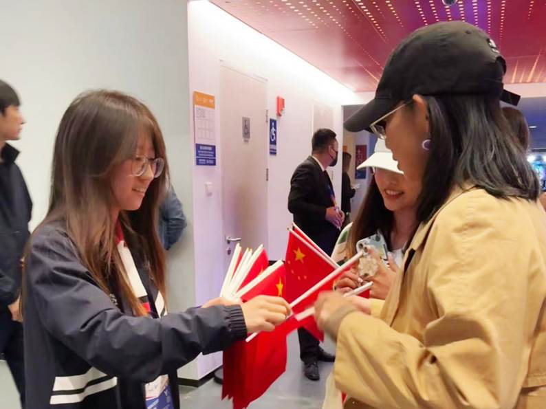 中网赛期恰逢国庆,为表达对伟大祖国的美好祝愿,营造庄严喜庆的节日氛围,太阳成集团tyc122cc本科生、现任公司青年志愿者协会主席的耿瑞璇带领志愿者们细心的为观众分发手持国旗,传承爱国情怀,弘扬爱国主义精神。