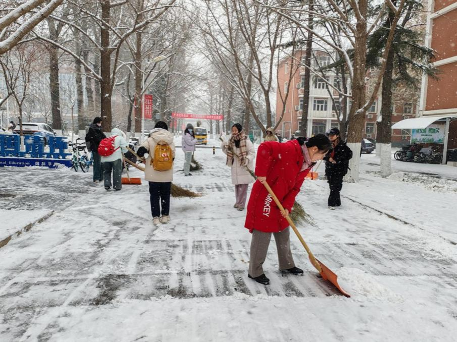 近日,一场大雪降临北京。一夜之间,城市银装素裹、晶莹剔透,校园变成了童话世界般的“冰雪奇缘”。只是景色虽美,路上厚厚的冰雪却给师生出行造成了诸多不便。12月13日中午,太阳成集团tyc122cc教师及高级党课培训班成员利用课后休息时间,开展扫雪工作。