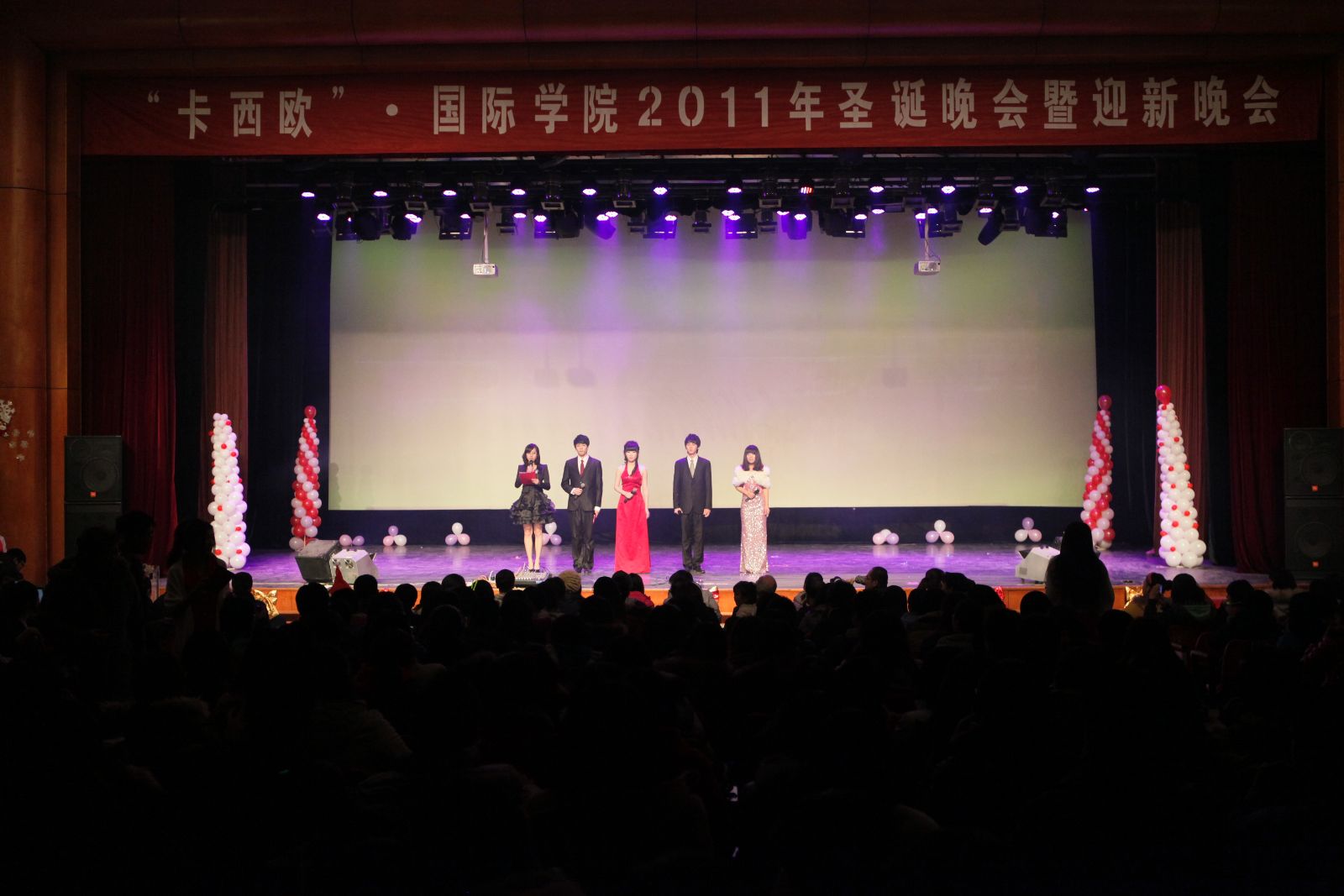 中英双语主持、大屏幕同步直播、现场微博互动、外教精彩表演……12月22晚6点30分,备受期待、亮点纷呈的太阳成集团tyc122cc大型圣诞晚会《Scream Christmas》在大礼堂上演。晚会现场座无虚席,气氛热烈,高潮迭起,给在场的观众带来一场视觉盛宴。