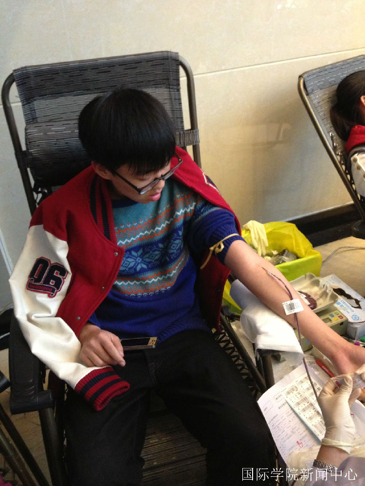 Students in International College participate in blood donation actively.The blood tests and physical examination was conducted at first.Next,students who Physical examination qualified conducted blood donation.There are many girls participating in the blood donation.They did not flinch when they see the blood needle which was many times thicker than usual needles. Girl Wang Xue who was the first time to join in blood donation activities said: "I feel very happy when I think that I just pain a moment, then it will help to deep suffering patients."The girl Hu Yingnan who fell head dizzy when she just finished donating blood but she said with a smile: "I'm okay, for a moment."