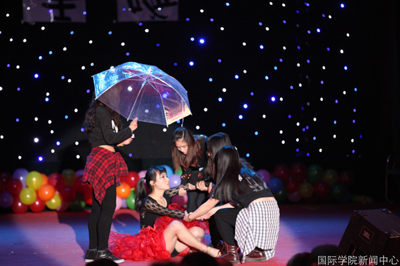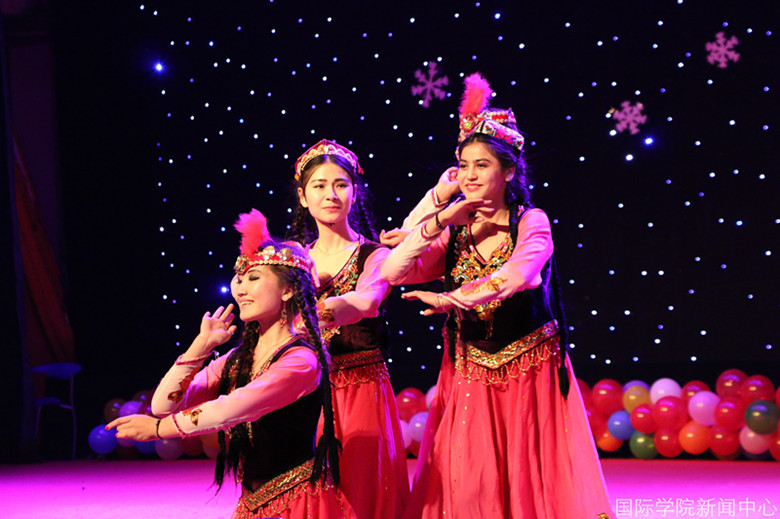 异域风情刮进礼堂,四位美丽的新疆姑娘款款走向台中央,她们头顶瓷碗,手拿瓷盘,在台上翩翩起舞。台下观众在惊叹她们美丽舞姿的同时,也不禁为她们捏一把冷汗。但姑娘们的表现精彩至极,异域的风情惊艳全场。