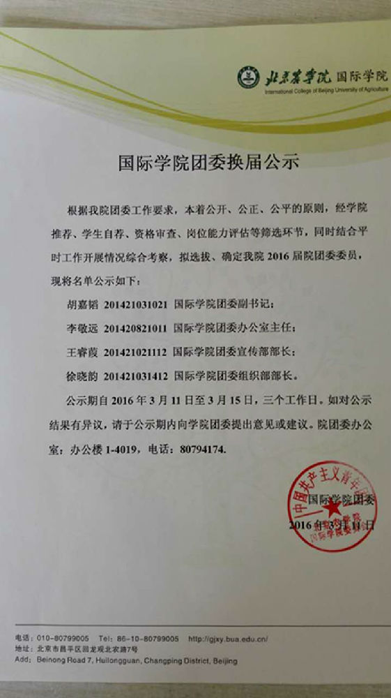 大会第三项:由新当选团委副书记胡嘉韬同学发言,他和大家谈了自己对将来工作的一些展望与目标,也向大家表达了自己对于做好工作的决心和信心。他呼吁大家一起努力,共同将我们的“团员之家”经营地温暖而又活力四射,辅助国院团员青年成长、成才。