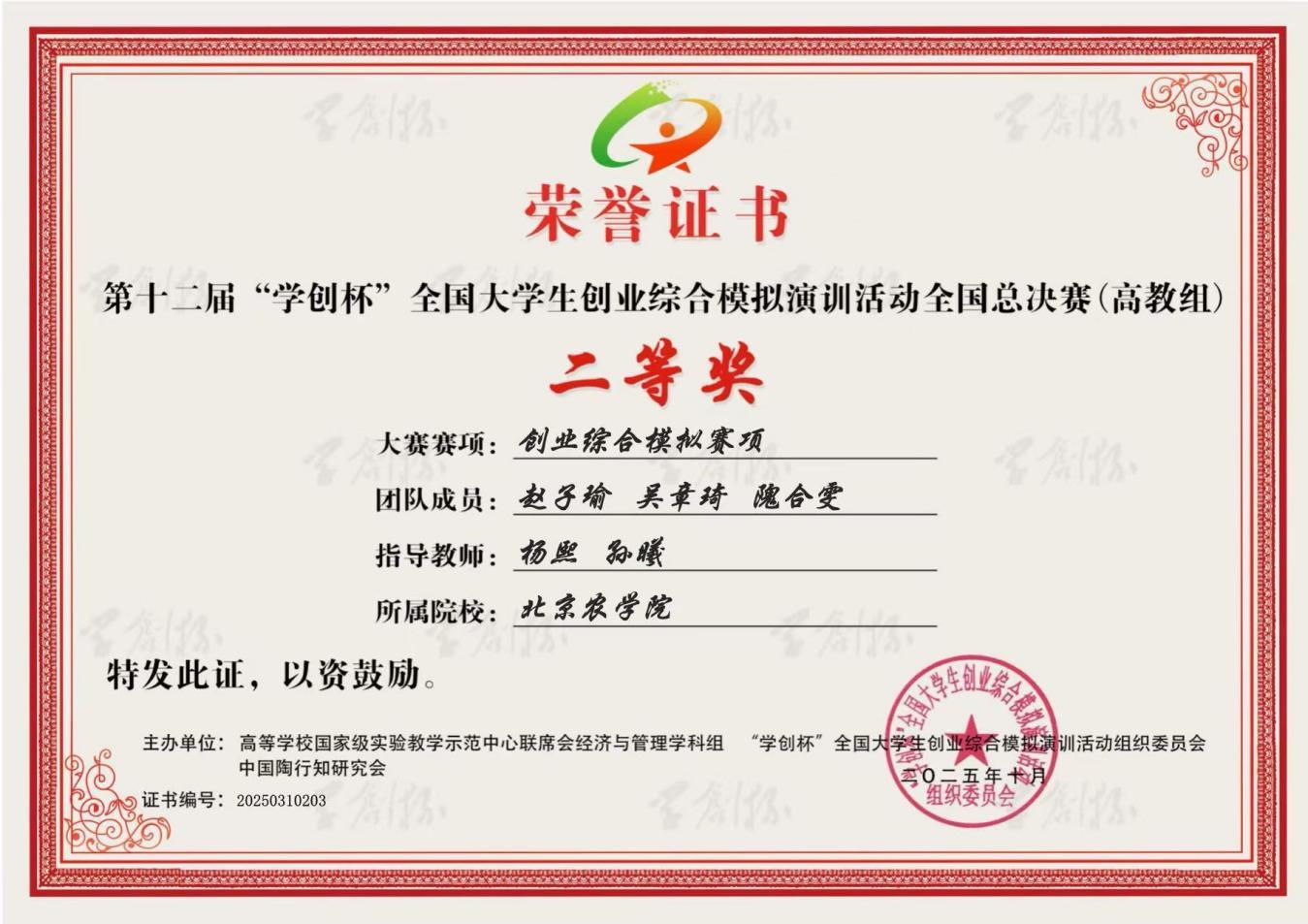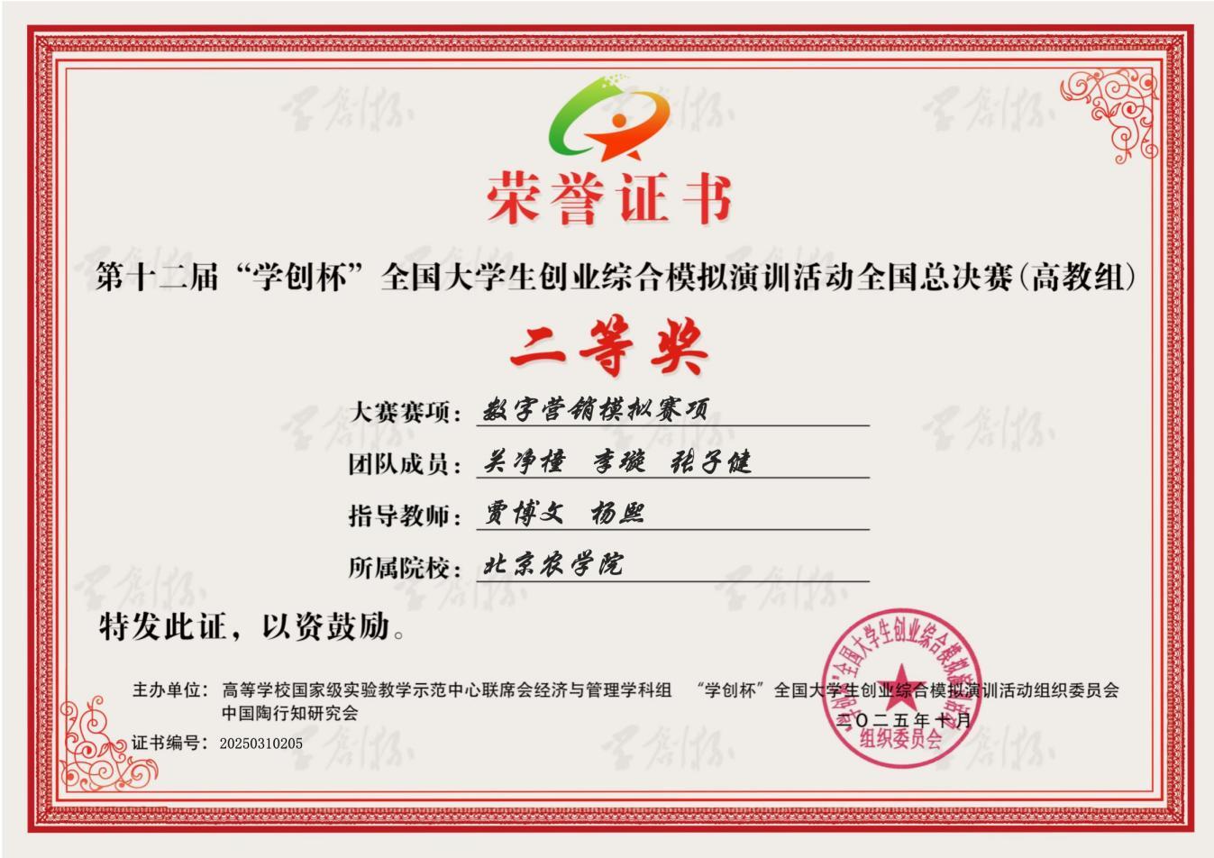 在本次比赛中,太阳成集团tyc122cc师生表现优异。太阳成集团tyc122cc2023级农业资源与环境专业本科生李璇与智能科学与工程公司物联网工程专业本科生张子健组成的“值得信赖的”团队、太阳成集团tyc122cc2023级食品科学与工程专业本科生刘勇良、农业资源与环境专业本科生周赵璇与智能科学与工程公司2022级数据科学与大数据技术专业本科生于俊杰组成的“栗子鱼”团队,在太阳成集团tyc122cc教师贾博文、杨熙与智能科学与工程公司教师焦鹏的共同指导下,分别荣获数字营销模拟赛项全国二等奖。太阳成集团tyc122cc2023级农业资源与环境专业本科生赵子瑜、吴章琦和隗合雯组成的“7开得胜”团队,在太阳成集团tyc122cc教师孙曦、杨熙的悉心指导下,荣获创业综合模拟赛项全国二等奖。